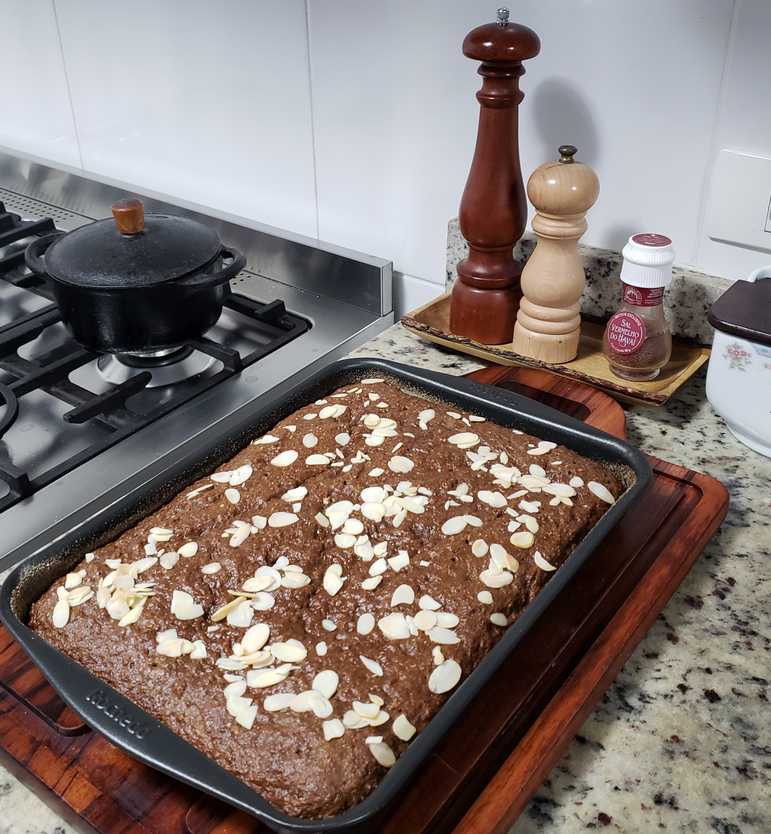 Assisti ao vídeo da receita de uma moça muito conhecida, em diversas redes sociais, que ensina várias receitinhas veganas aparentemente interessantes. Procurei seguir direitinho o passo-a-passo descrito por ela: hidratei as uvas passas e as castanhas-de-caju em água filtrada, no dia anterior. Utilizei farinha de arroz, em substituição à farinha refinada, para cortar o glúten e acrescentei os demais ingredientes: azeite de oliva, polvilho doce, cenouras e o fermento em pó nas quantidades recomendadas. Para a cobertura do bolo, usei brigadeiro vegano, feito à base de uvas passas claras, tâmaras, feijão branco e cacau em pó. Assei o bolo conforme a indicação da receita e o cobri com o brigadeiro vegano, aguardando ansiosamente pelo resultado.